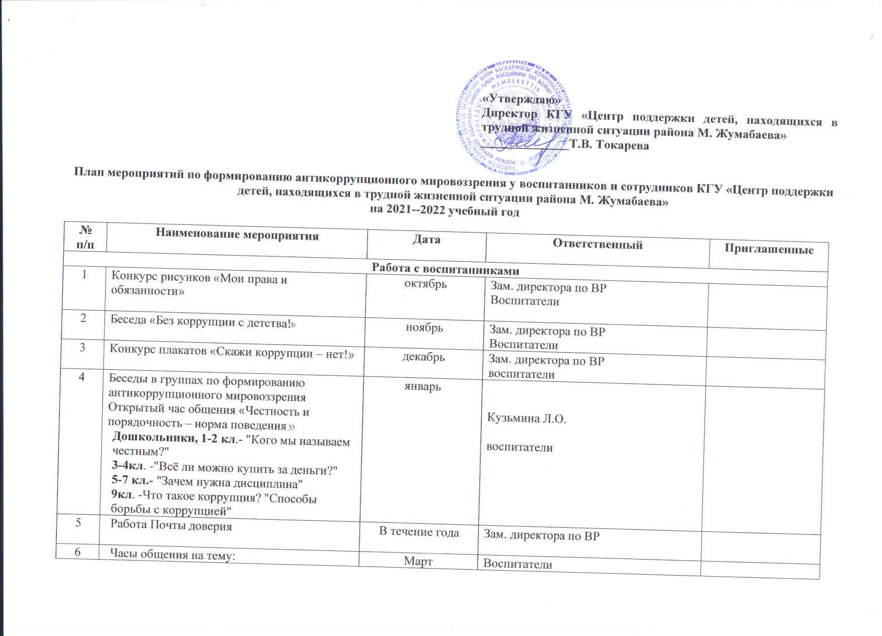 В рамках реализации программы по формированию антикоррупционной культуры в КГУ «Центр поддержки детей, находящихся в трудной жизненной ситуации района Жумабаева» разработан и утверждён план мероприятий на 2021-2022 учебный год на основании Закона Республики Казахстан «О борьбе с коррупцией»; Указа Президента РК «О дополнительных мерах по усилению борьбы с преступностью и коррупцией и дальнейшему совершенствованию правоохранительной деятельности в РК», Кодекса РК об административных нарушениях.