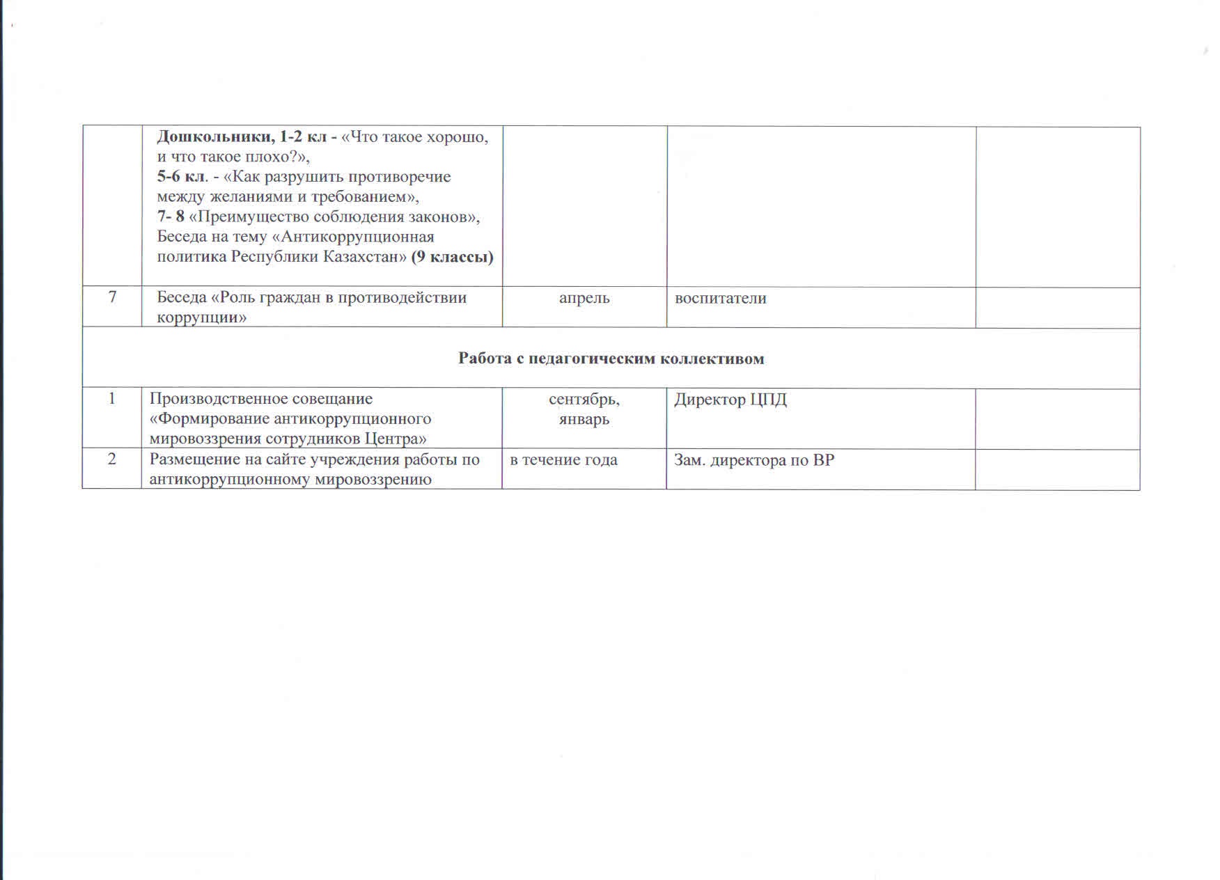 В рамках реализации программы по формированию антикоррупционной культуры в КГУ «Центр поддержки детей, находящихся в трудной жизненной ситуации района Жумабаева» разработан и утверждён план мероприятий на 2019 – 2020 учебный год на основании Закона Республики Казахстан «О борьбе с коррупцией»; Указа Президента РК «О дополнительных мерах по усилению борьбы с преступностью и коррупцией и дальнейшему совершенствованию правоохранительной деятельности в РК», Кодекса РК об административных нарушениях.