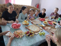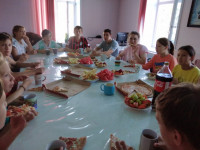Гости мероприятия приехали не с пустыми руками, они порадовали детей всеми любимой пиццей, фруктами, напитками. После столь серьёзного мероприятия воспитанники собрались за круглым столом.